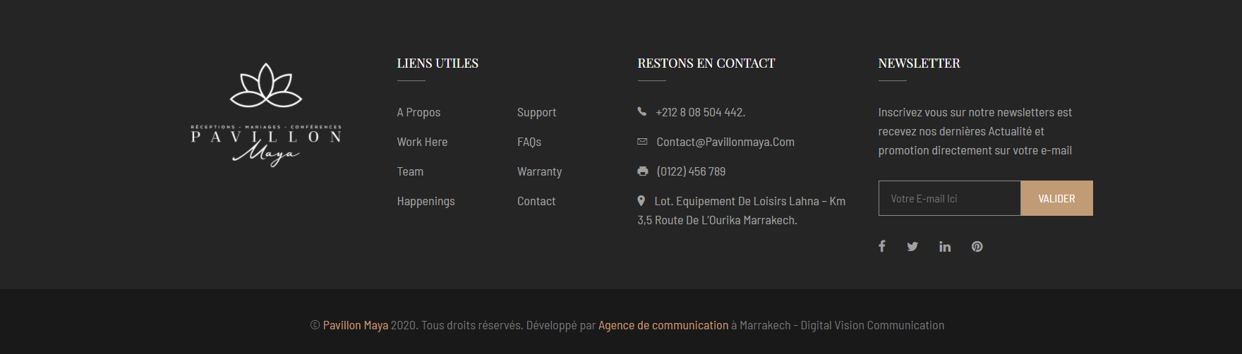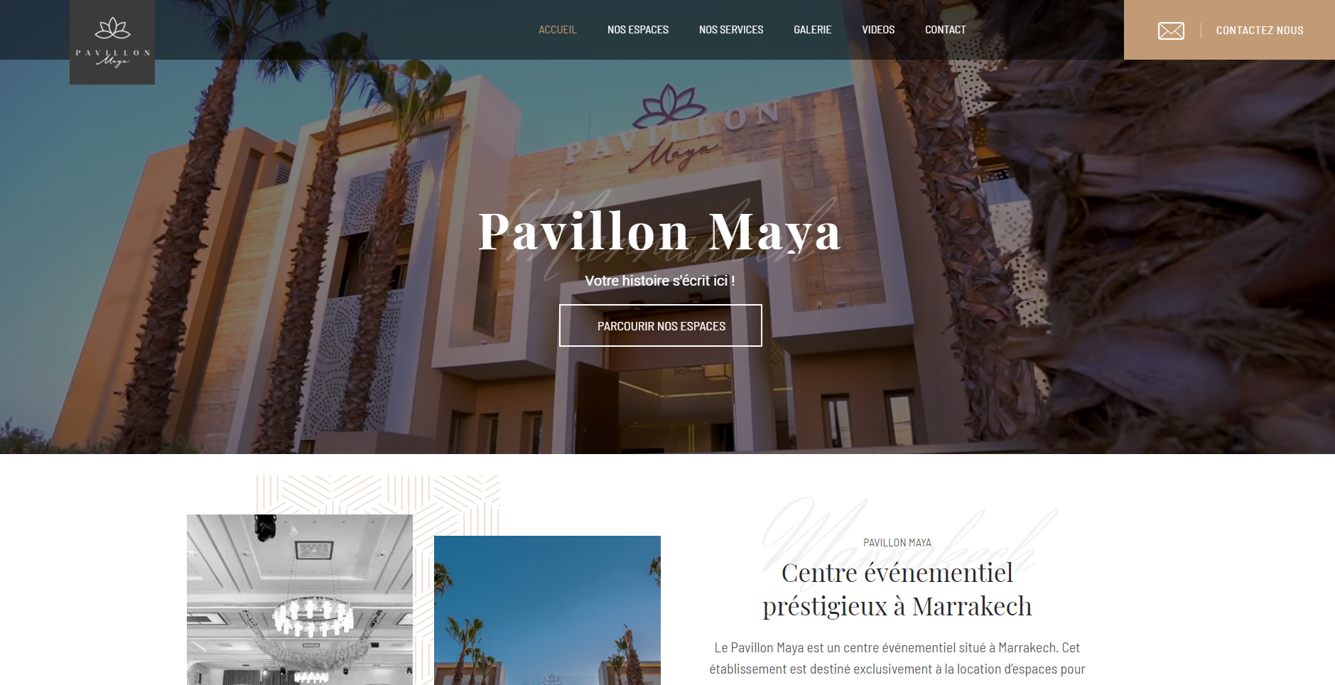 Le Pavillon Maya est un centre événementiel situé à Marrakech. a sollicité notre aide pour la création du site internet de l’établissement. Le Pavillon Maya est un centre événementiel situé à Marrakech. Cet établissement est destiné exclusivement à la location d’espaces pour vos événements privés et/ou professionnels. Son style contemporain en plus de sa superficie de plus de 2000 m2 font de ce lieu le choix idéal pour accueillir tous vos événements tels que les réceptions, les mariages, les conférences et tout autre type d’événement. Le résultat est le suivant!